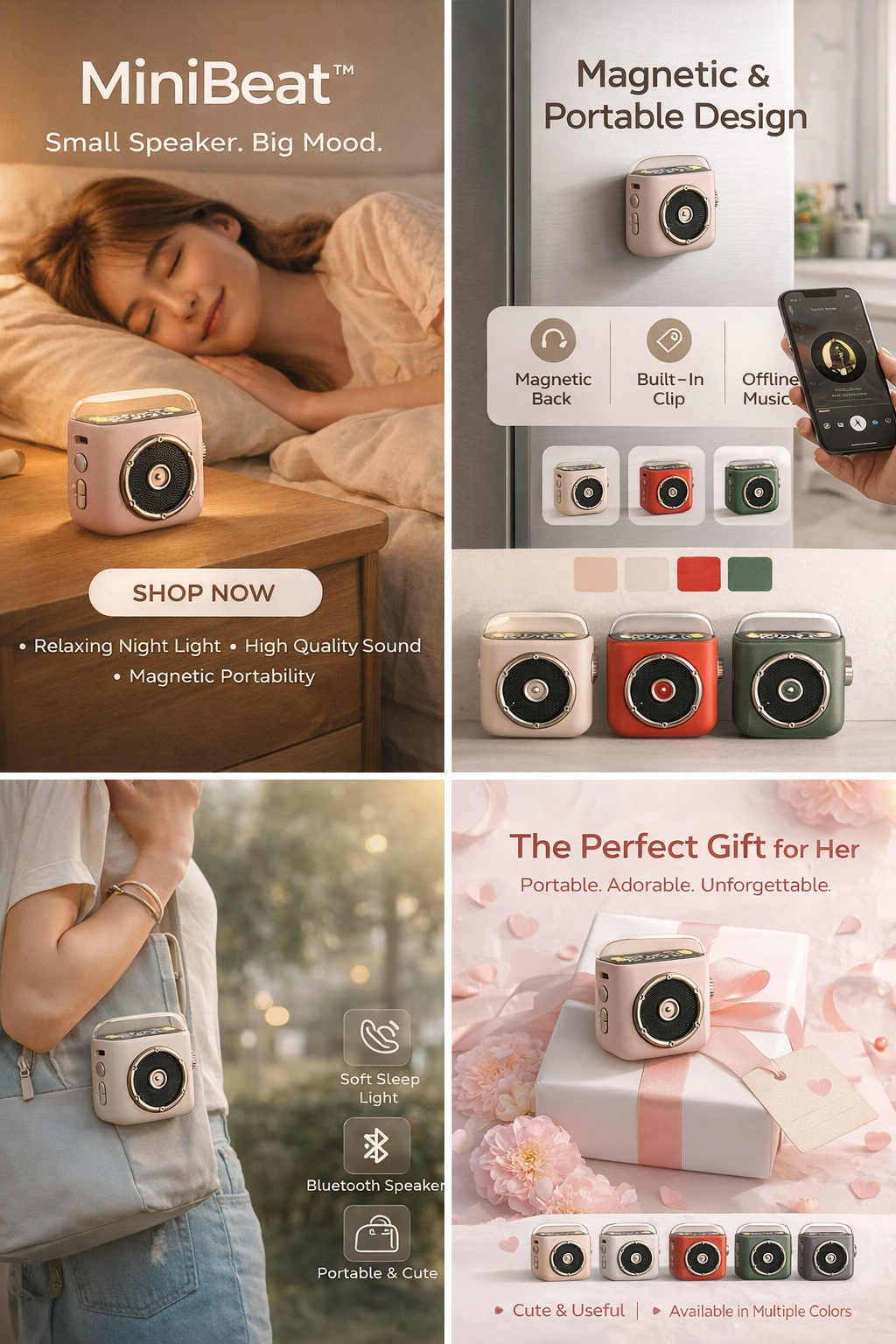 MiniBeat is honestly amazing for its size. The sound is clear and loud, the night light is soft and relaxing, and I love how easy it is to clip it onto my bag or stick it to metal surfaces. I use it in my bedroom every night and also take it with me when I travel. Super cute, practical, and totally worth it!
