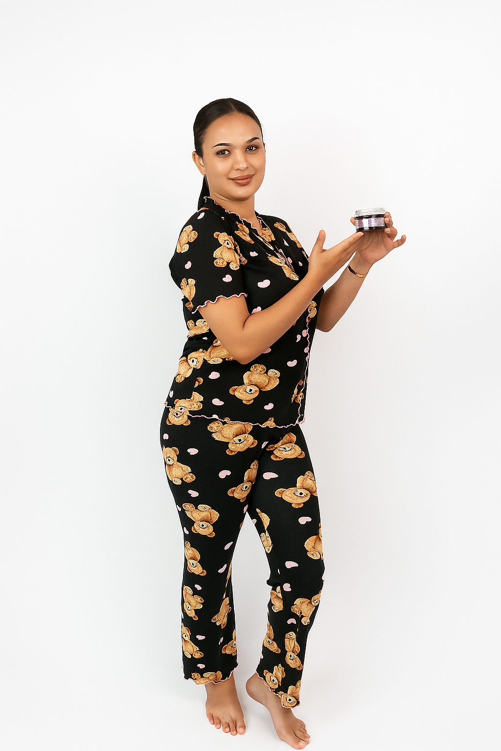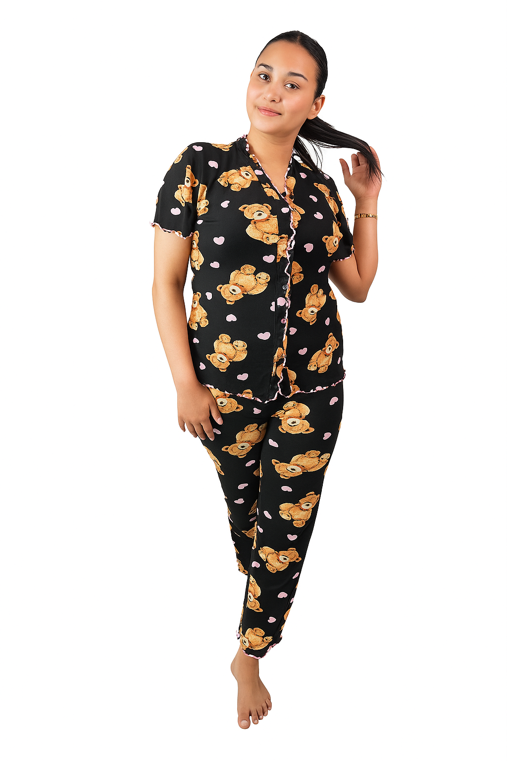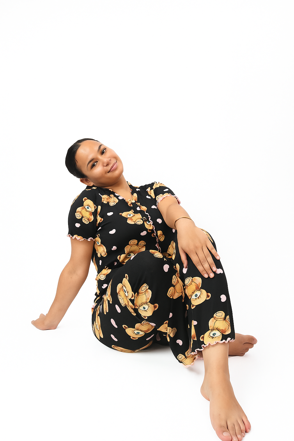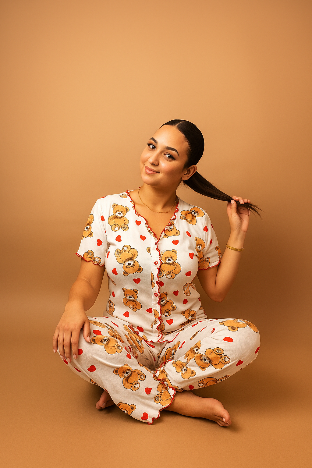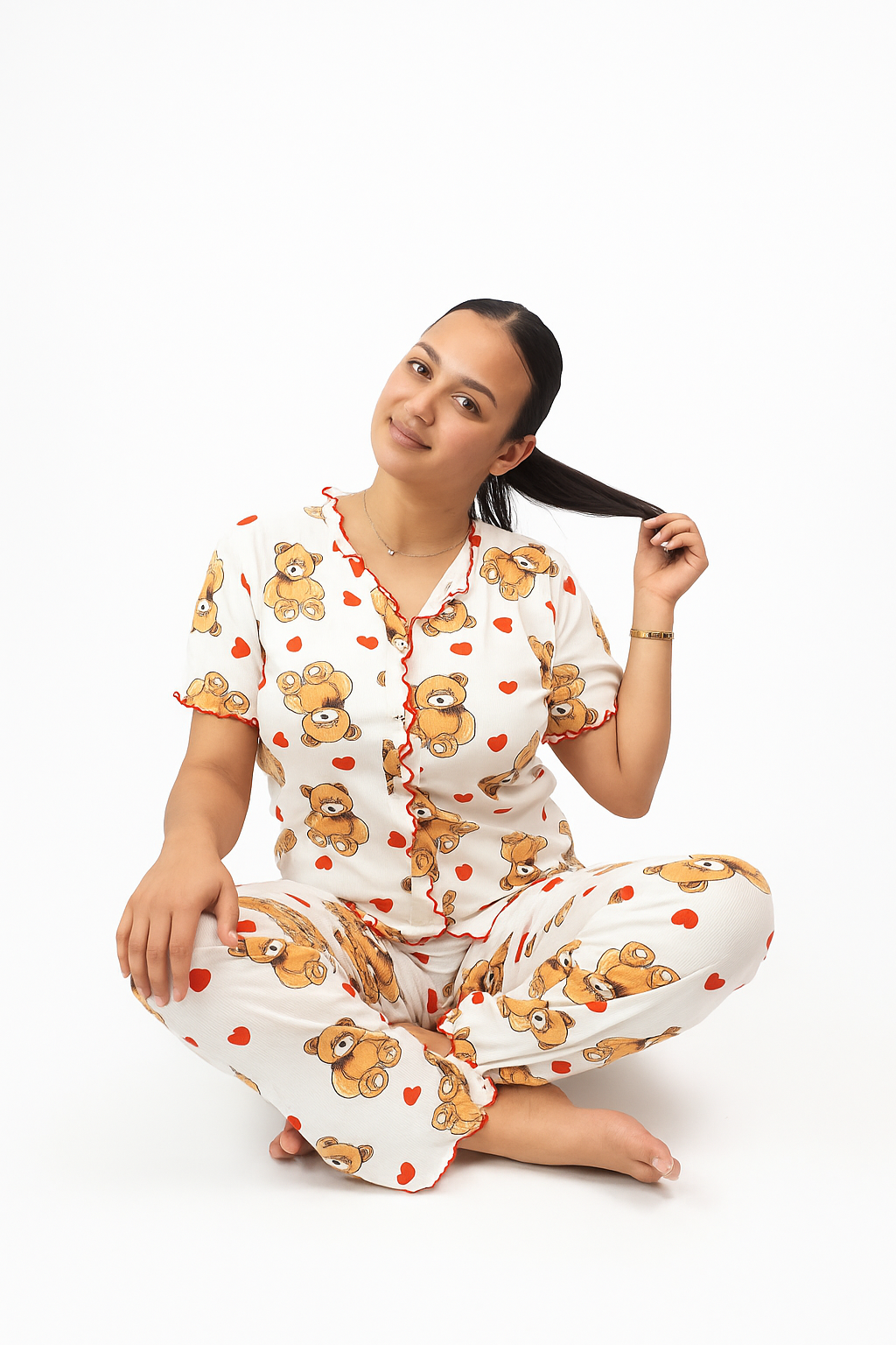 Playful yet delicate prints — from sweet teddy bears to red hearts and soft cherry motifs — each detail created to awaken your inner child and bring you calm, joy, and a smile before bedtime.